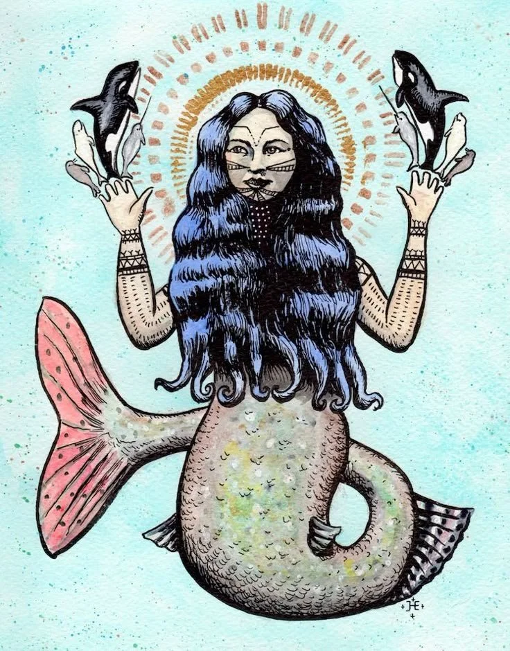 Terrified for his own life, her father cast Sedna overboard. She clung to the side of the kayak, but in his fear, he cut off her fingers one by one. She was afraid to let go, only when all of her fingers were cut off did she fall into the sea. Her severed fingers transformed into seals, whales, and all the creatures of the ocean. Sedna sank into the depths, confronting her own darkness and abysse. Only then did she become the ruler of the underworld ocean, the Mother of all sea beings.